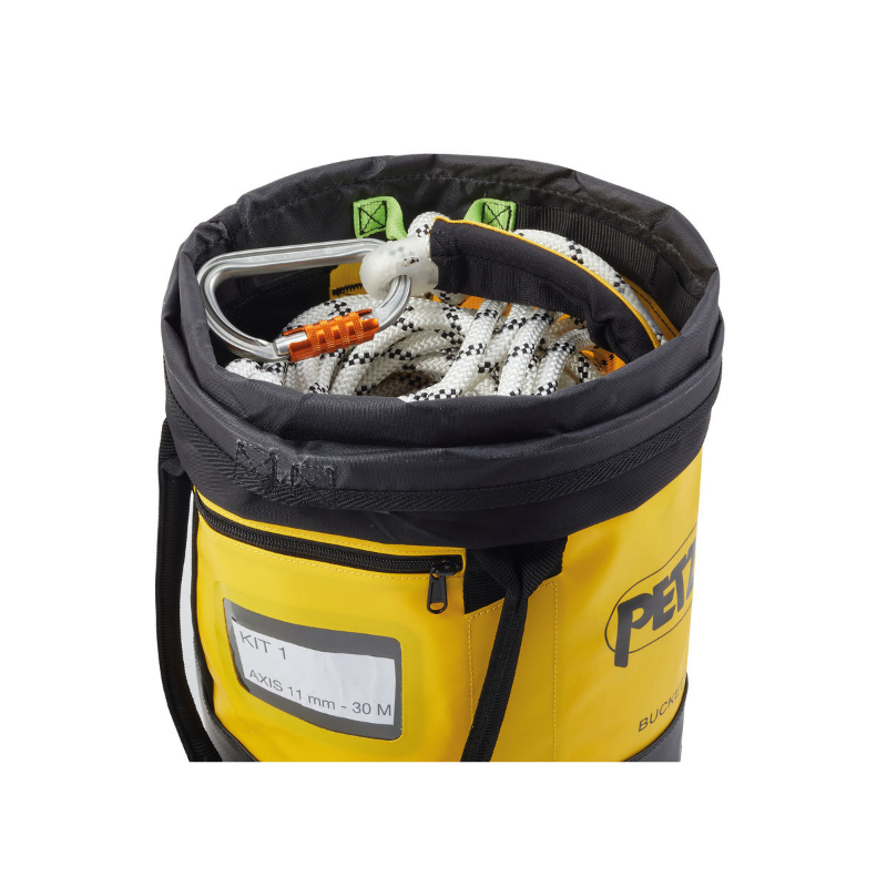 Simple and durable, the BUCKET 15 rope bag allows you to store up to 45 meters of 11 mm diameter rope. It remains upright and keeps its shape, even when empty, for easy access to the inside of the bag. It has an exterior pocket to store personal items and a marking area to quickly identify the contents of the bag. Its construction of TPU tarp material allows regular to intensive use. Available in three colors: yellow, red, and black.